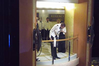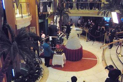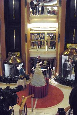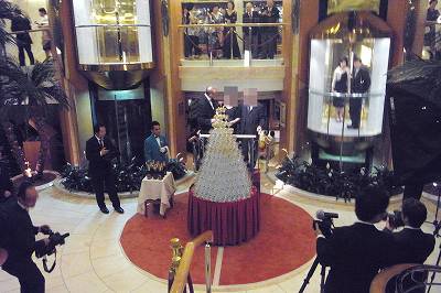船によっては吹き抜けアトリウムの備え付けの階段を使ったりもするんですが、この船はまさに真ん中にシャンパングラスタワーを据えつけて、階段も専用品でしたね。