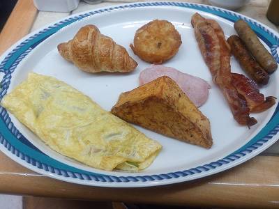 こんばんは。 この下船申告書、気が利いてますネ。 しかも、かなり早い段階での配布ですもんね。 (下船時間が意外と思い通りにならなかったのは残念ですが…) 下船後の手配がキチンとしていると、クルーズ自体をエンジョイできますもん♪ ところで、ビュッフェのお皿、大きく見えます。 クロワッサンやハムが小さく感じるので… オムレツは流石に美味しそう〜♪ コーヒーがお口に合わなかったのは残念ですねぇ。 コーヒーって、飲む機会が多いのでコレが口に合わないと、結構つらそう。 紅茶でも何でも好きなモノ頼めばいいだけですが、意外と面倒なんです。