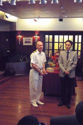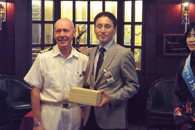 今回のクルーズ、寄港地毎になにやら式典があるんですが、この釜山でも歓迎セレモニーが催されました。会場はいつものホイールハウスバー。
