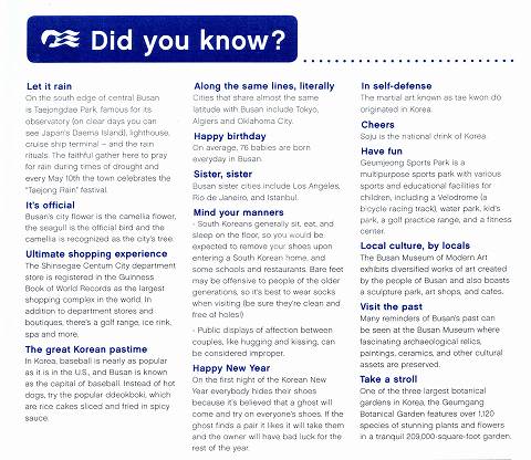 2件今日ワァ! 韓国、3回も行ったんですか、それもCRUISEで!! オイラ、韓国は中国以上に興味あります。 だて、中国語は漢字でしょう。何となくOKだけど、 ハングルは日本人と顔が似てるのに、何が書いてあるか 全く想像できません。 いつか行きたいですネェ!それもCRUISEでサァ!