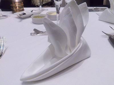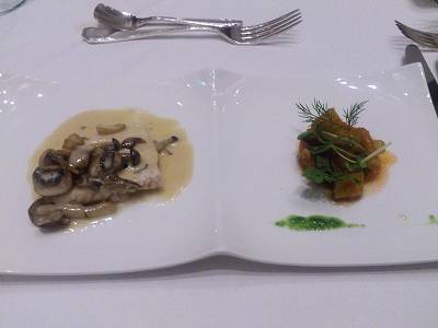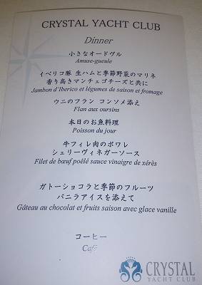 おお、素敵。クラブハウスで夕食を頂いてからクルーズと言うわけですね。 まずナプキンの折り方、素晴らしいです。料理のお味も申し分なかったでしょうがボリュームこのぐらいが調度いいかな。