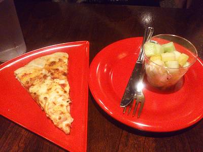 プロムナードカフェのピザとカットフルーツ
