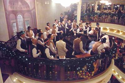 奥の階段にそれぞれのフロアのウェイター達が集合します。