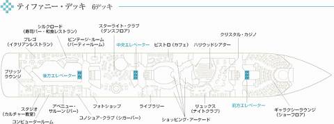 そのまま船内に入ります。入ったところがティファニーデッキ。6階です。