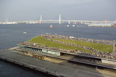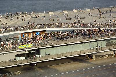 鯨の背中の突端もなかなかの人出。奥には消防艇も見えてます。放水ありそう。