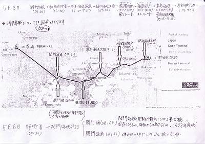 橋の通過時刻を記入した航路図。