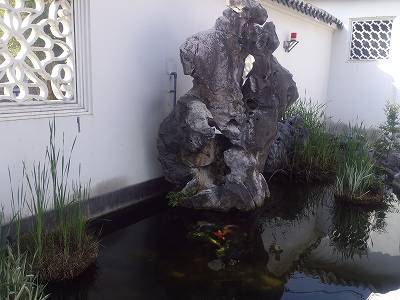 中国でよく見る、例の穴だらけの石ですかね... 池には鯉が... P.S. やっぱり太湖石だそうです。 池も含めて「太湖の泉」っていうそうです。