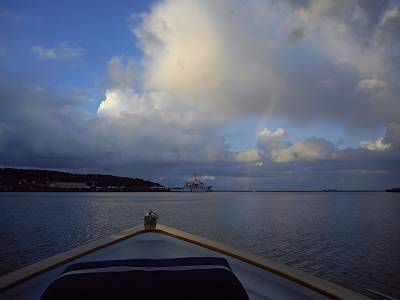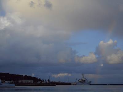 虹みえます。(o^^o) 空と雲や虹、夕焼けと合間って、よいプチクルーズでしたね〜。 仮面ライダーのロケ場所は、昔見たように思いますが。。。?(^。^)