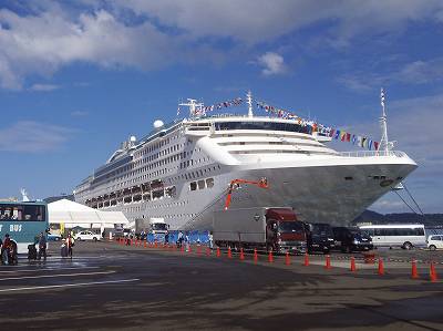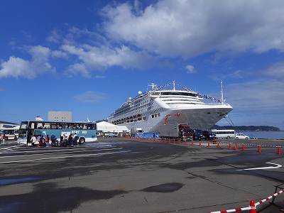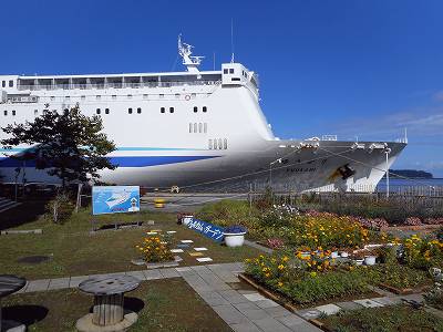 サン・プリンセスの後ろにはフェリーターミナルと新日本海のフェリーが見えます。