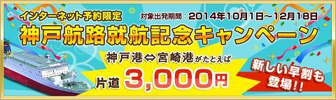 2014年10月から神戸港フェリーターミナルからの新航路解説に伴う記念料金。 神戸港フェリーターミナル発 19:30 宮崎港着 翌08:40 就航記念価格。(12月18日まで) 通常運賃12740円が片道3000円(2等:毎日5席限定) ■就航記念 早割28 大人2等:6000円/寝台7000円 子供2等:3000円/寝台3500円 ■就航記念 早割14 大人2等:8000円/寝台9000円 子供2等:4000円/寝台4500円
