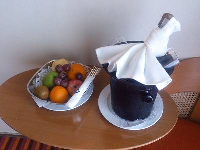 ウェルカムドリンクとフルーツ、お部屋にあると嬉しいですね(⌒▽⌒)しかも豪華です!! ゆるきゃらには、ちょっとびっくりです。 船の写真付きのカードはいいですね。(⌒▽⌒)