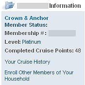 Take a moment to take in your cumulative cruising adventures - you'll find your entire cruise history here. Check on your Cruise Points, see what itineraries you've traveled, and if you have any questions, you can Contact a Crown & Anchor Representative. After January 21, 2011 all cruises receive one cruise point for every night you sail. Please allow 14 days after you return from your cruise vacation for your records to be available.