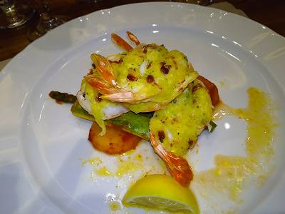 "ニンニク和えポテト、ベビーズッキーニとアスパラガス、焼ジャンボ海老"