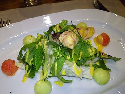"Mesclun mix with Honey Mustard dressing on a slow poached lobster meat"
