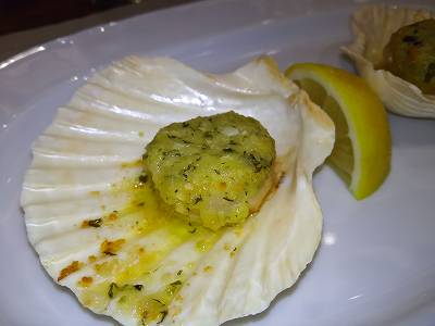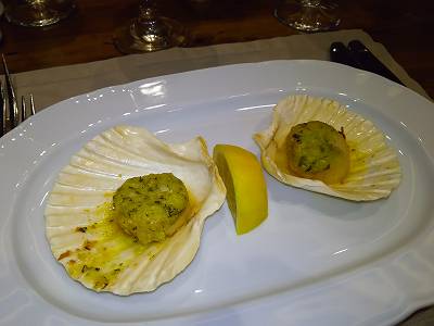"赤ピーマンのベストとのオーブン焼、アーモンドをまぶしたホタテ"