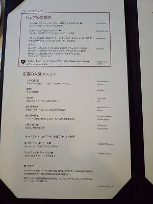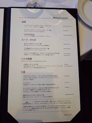4件あれれ? 量が少ないですね。 日本人向けにしたかな? 次回のプリンセスでは、選べなかったら2つ頼もうと思っています。 (デザートは、いつも2つ頼んでますが(≧∇≦)) メニューありがたいです。 ありがとうございます! このメニューだと、スープ両方飲みたい。(^。^) あっ!スフレがある。10年程前に乗船した時、スフレがオススメと聞き、食べたら美味しくてハマりました。食べてみましょ(^-^)