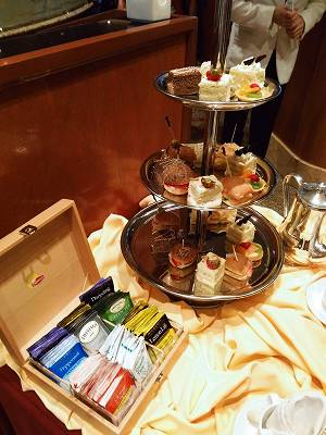 5件5月のクルーズも今回も同じですが、 紅茶は撰べませんがサンドイッチ、ケーキはトレーから選べます。 スコーンも温かいのがアルミ箔に入ってきてクリームとジャムも続けてサーブされます。 私が食べるのはスコーンとフルーツケーキのみです。 船友さんと話をする楽しみに行きます。