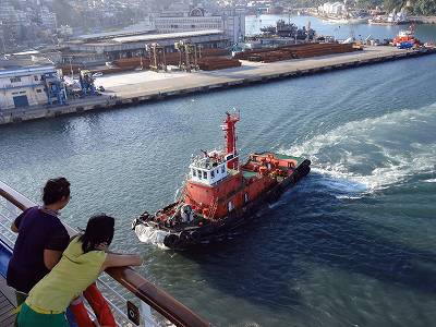 基隆の港って、ターミナルがある側とは反対側(今回で言えばアクエリアスが停泊してた方)に入り江みたいな部分があるんですけど、ココを使って方向転換したんです。
