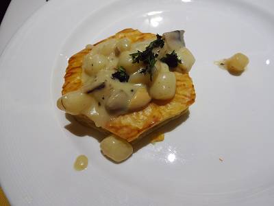 パイにホタテの貝柱のソースがかかってる...