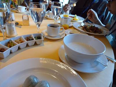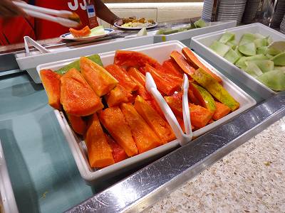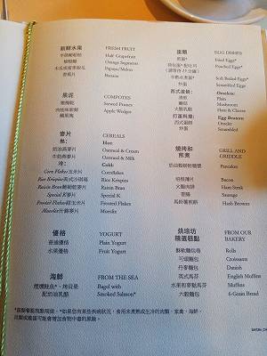 うわぁ〜ん! 朝から、タマラン メニューじゃないッスかー!!v(^_^v)♪ 「熱原味豆奬 手配手工油條」(文字が違うのはご勘弁を) とか 「清粥小菜」の小菜部分「猪肉髭、皮蛋、香油花生…」 とか 「痩肉粥」 とか、うぉー!!我が家の胃袋、鷲掴み!! メニュー解読は、与太爺さんチみたいに香港、台湾慣れしておられる方や、我が家みたいな「台湾朝ご飯好き好き星人」には、ツボにハマること請け合いですねー♪ 逆に繁字メニュー初見の方には、ダイニングでの朝食はキツイかなぁ… ウェイターに聞けば教えてくれるでしょうし、西洋食もあるから大丈夫かな。 お味は如何でしたか? ビュッフェの生ライチ(?)とパパイヤも高得点♪♪
