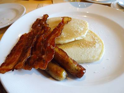 パンケーキにベーコンとソーセージをトッピング