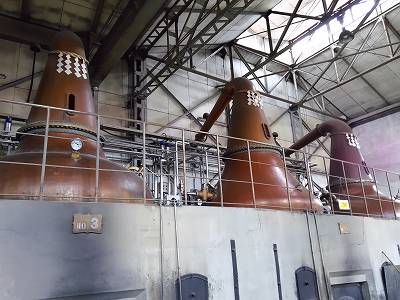 ポットスチル(単式蒸溜器)の現物が並びます。