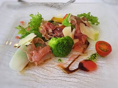 "いろいろ野菜の軽いマリネと生ハムのサラダ仕立て"