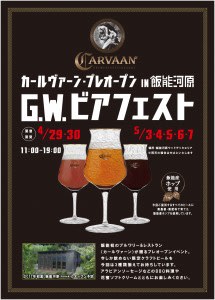 ゴールデンウィークは飯能河原へ! 4月29、30日、5月3、4、5、6、7日の7日間、 「〜CARVAANプレオープン IN 飯能河原〜G.W.ビアフェスト」 を開催します。 今夏のオープンを目前に控え、今しか飲めない限定クラフトビールを今回は3種類揃えてお待ちしています。 アラビアンソーセージなどのBBQ料理や、オリジナルソフトクリームとともにお楽しみください。 時間は11:00〜19:00、雨天の場合は中止とさせて頂きます。入場無料。