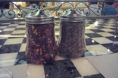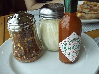 テーブルには、タバスコ、パルメザン、Crushed Red Chili Pepperが...