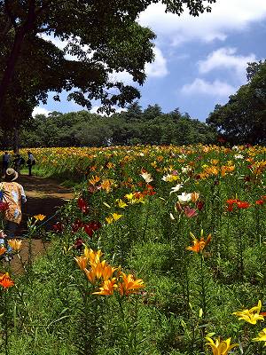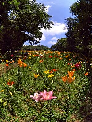 『ところざわのゆり園』では、約3万平方メートルの自然林に50種・約45万株のゆりが咲き誇り、森林浴と散策が楽しめる。園内は早咲きのすかしゆり種と遅咲きのハイブリッド種がカラフルな色と優雅な香りに満ちあふれた癒しの空間を演出する。