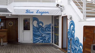 この船の場合、"BLUE LAGOON"はプールサイドにありまして...