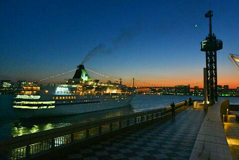 2件きれいな写真ですね。 夕焼けに月、澄んだ空の中を行く船。美しい。(o^^o)