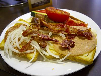 トースト、ハム、焼きトマト、ベーコン、オニオンスライスといったところ。