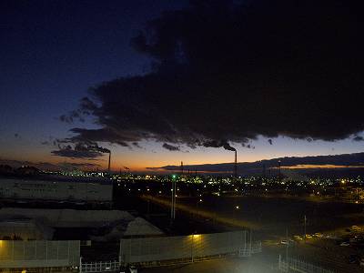 工場の排煙が夕陽に映える...