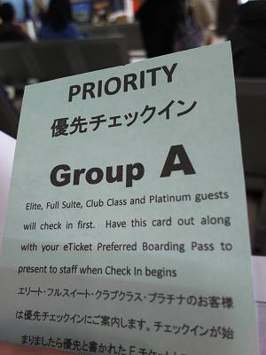 優先チェックインの資格があるリピーターステータスプラチナ以上の乗客が、