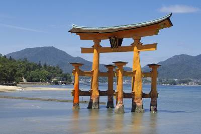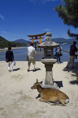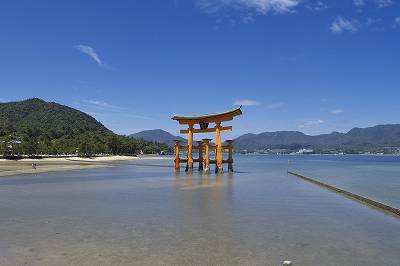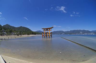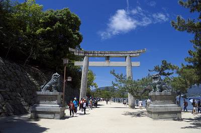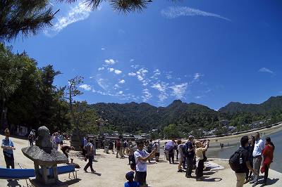 フェリーから見てた限りでは、結構な干潮で、鳥居の根本まで人が入ってたので。
