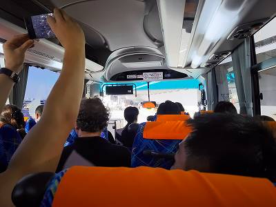 このバス、船に戻るクルーを補助席に乗せて出発。