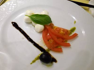 "petals of tomato and mozzarella fiordilatte with pesto sauce and reduction of barsamic vinegar of modena"