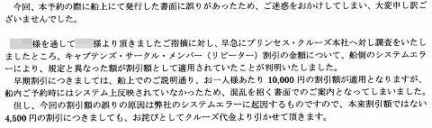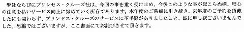 というわけで、船上での予約確認書どおりの支払いに落ち着いたのですが、その後、総代理店の営業部長名義で詫び状が届いたんですよ。