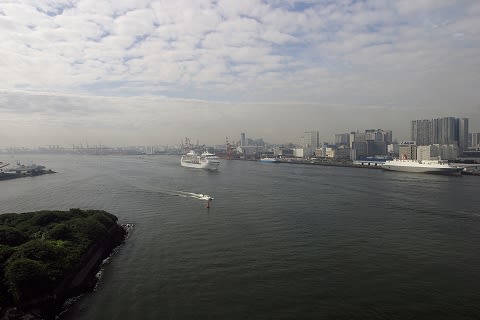 確かに、上から俯瞰で撮れる擬似空撮感覚が味わえる場所なんですが... いろいろと縛りがあってなかなか難しい場所だったりします。 とくに東京港の地形的な問題もあるんですが、光の向きが問題なんですよね。午後の入港だとGoodなんですけど。朝はお台場を背景に撮ろうとすると逆光になっちゃいます。しかも開場が9:00なので、それより入港が早いと入れませんしね。今日は記事中にもあるとおりで時間的にはギリギリのところでした。