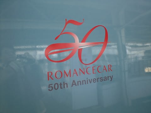 側面にはこんな表示もありました。 2007年7月6日をもって、小田急ロマンスカー3000形「SE」就役50周年を記念し、在籍中のロマンスカー全編成に50周年の記念ロゴが貼付されたもの。