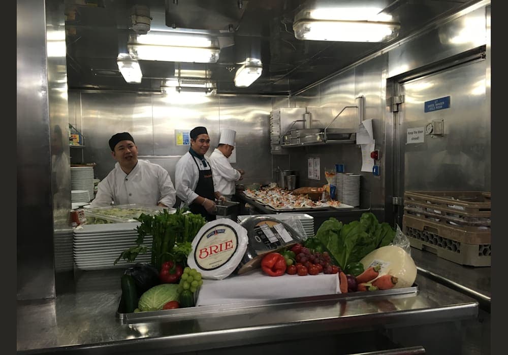 超大型の台風が来る、というのでどんなに厳しい航海になるのかと不安でしたが、函館を抜港し、日本海をぐるっと1日かけてまわって横浜に入港させる、という船長の英断に脱帽でした。 そんな船長の元でお仕事しているスタッフですから、皆さんとても良い感じでした。