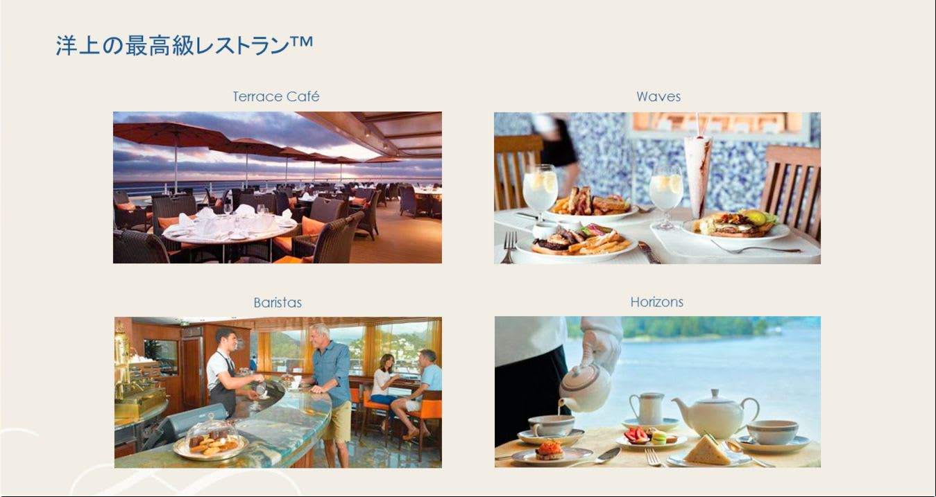 まず最初の魅力である、「洋上の最高級レストラン」、「正装不要の美食」ということなんですが、私共の美食という部分ですが、クオリティにこだわった食事をご提供させていただいておりまして、舌の肥えた日本のお客様にも非常に満足いただいております。