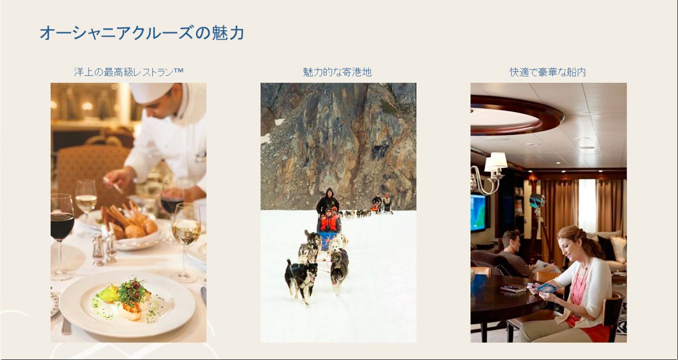さて、ここからはオーシャニアクルーズの魅力、先程ご案内いたしました3点を中心に、ご説明させていただきます。