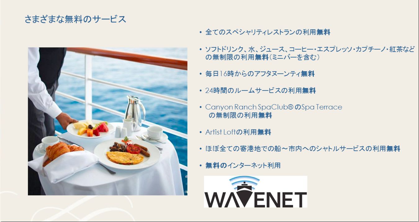 そして更にですね、最初にお支払いいただくクルーズ料金にかなり多くのサービスが無料で含まれているというのが非常に贅沢感を味わっていただけるポイントとなっています。
