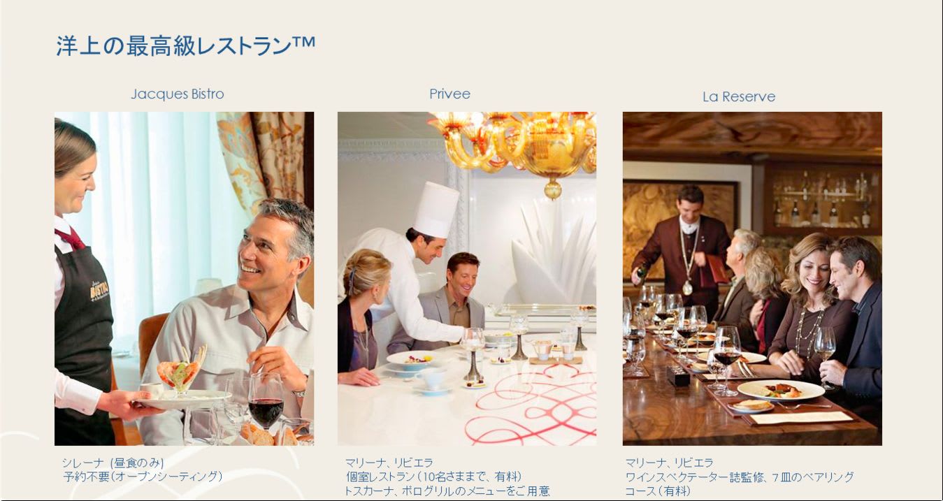 それからもう一つ、こちらは体験型のレストランになりまして、マリーナとリビエラ、Oクラスの船で体験していただけるレストラン になります。
