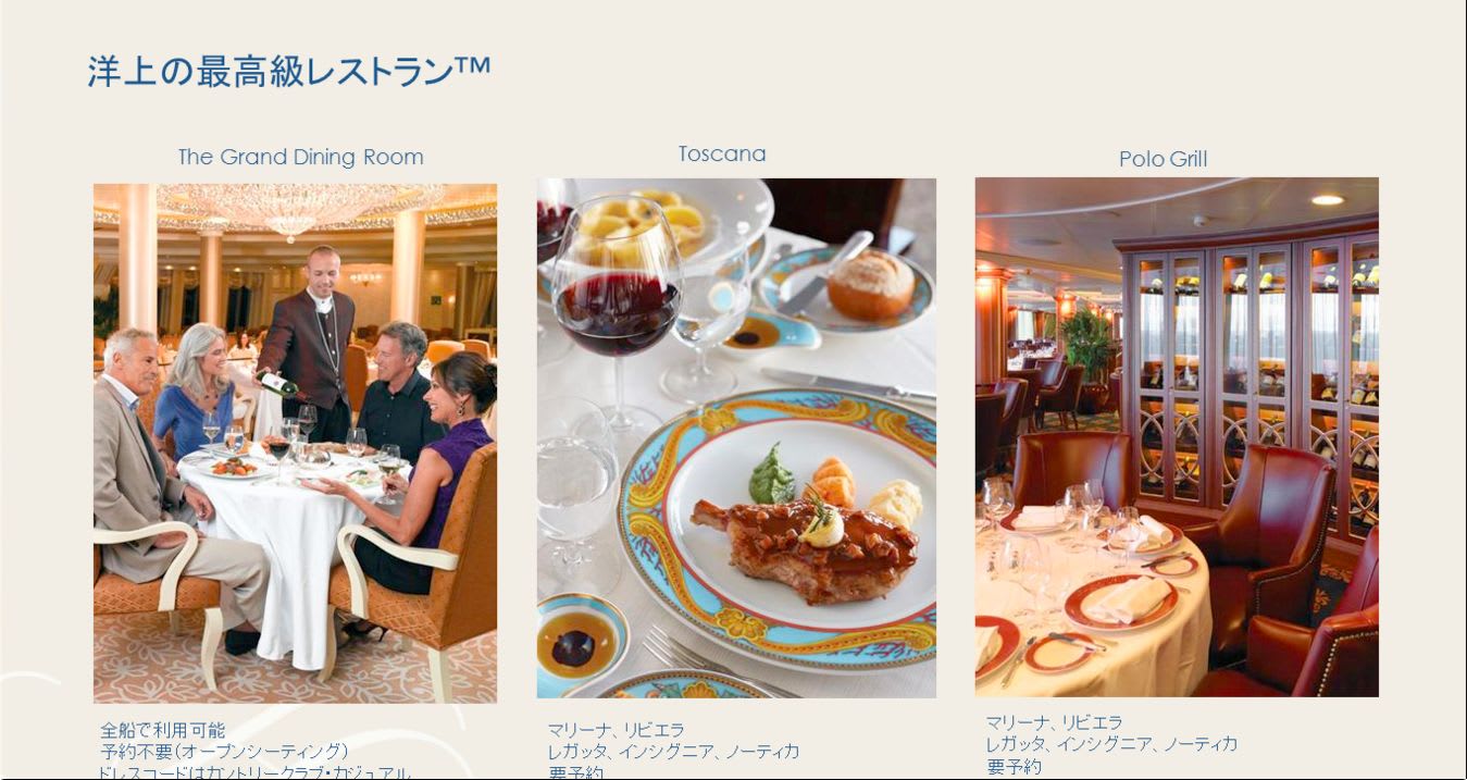 まずなんといっても美食の船として知られている、洋上の最高級レストランとしての魅力。