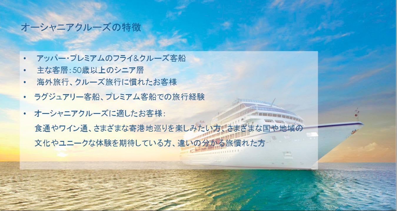 特にですね、旅のプロである添乗員の方にも非常に人気の高いクルーズとして定着しつつありまして、添乗員の方もご自分の夏休みとしてオーシャニアクルーズを選んでいただくという期待も増えております。