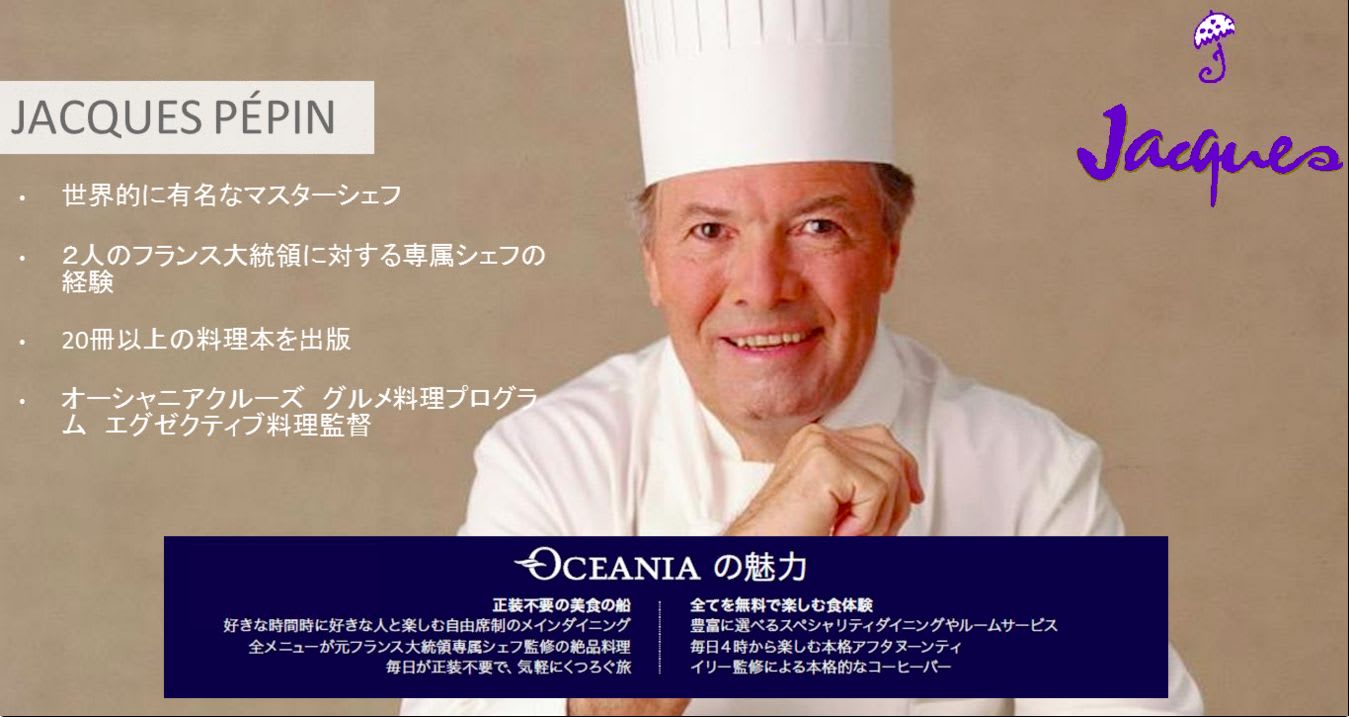 今までご説明させていただきました、洋上の最高級レストランなんですけれども、こちらは全てジャック・ペパン(Jacques Pepin)さんという方が監修したメニューをご提供しております。