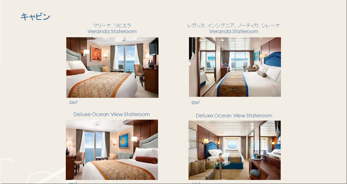 そのオーシャニアクルーズの船の中で、最新の情報をお伝えしたいと思います。まずOクラスでありますリビエラとマリーナ。日本の方の中では9割ということなんですが、来年の夏に日本語の分かる係員が乗船するということが決定いたしました。